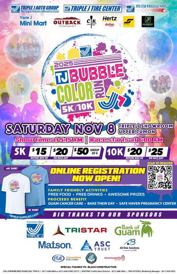 Online registration has officially opened for Triple J’s 2025 TJ Bubble Color Run 5K/10K, happening on Saturday, Nov. 8, 2025, at the Triple J Showroom in Upper Tumon.
