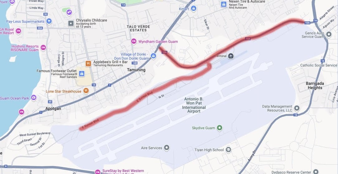 Drivers are advised that outer lanes from Route 10-A from the overpass at 76 Ocean Vista toward Marine Corps Drive and the outer lane (along fence line) of East Sunset Boulevard in Tiyan will be coned off.