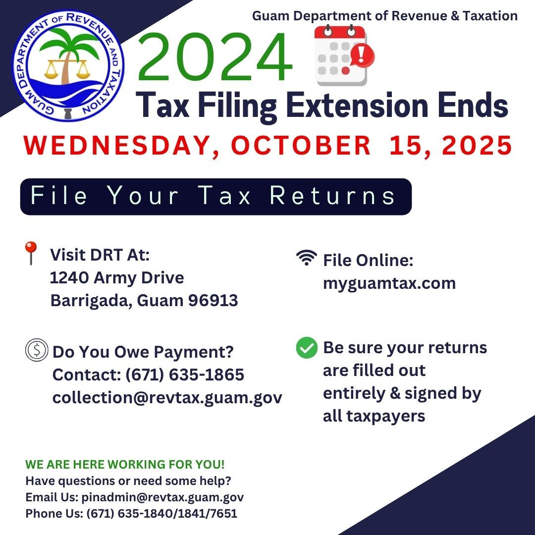 Taxpayers are reminded that the extended deadline to file individual income tax returns for tax year 2024 is Wednesday, Oct. 15, 2025. Guam taxpayers who requested the six-month extension from the April 15 deadline must submit their returns by tomorrow to