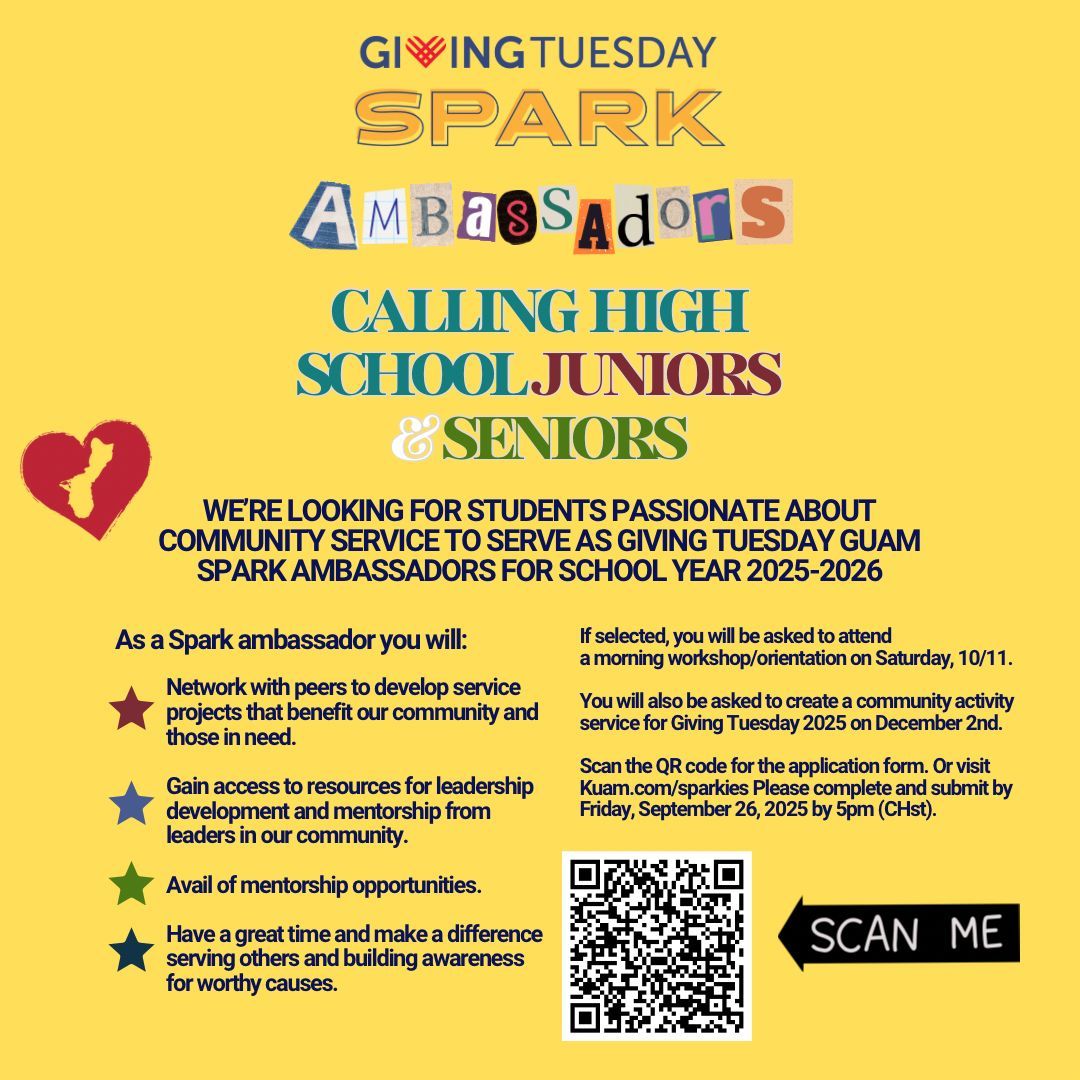 The KUAM Careforce is looking for youth leaders from around the island to participate as “Giving Tuesday Spark Ambassadors”. The Giving Tuesday Spark Ambassador program is a School Year 2025-2026 program in which passionate and purpose driven