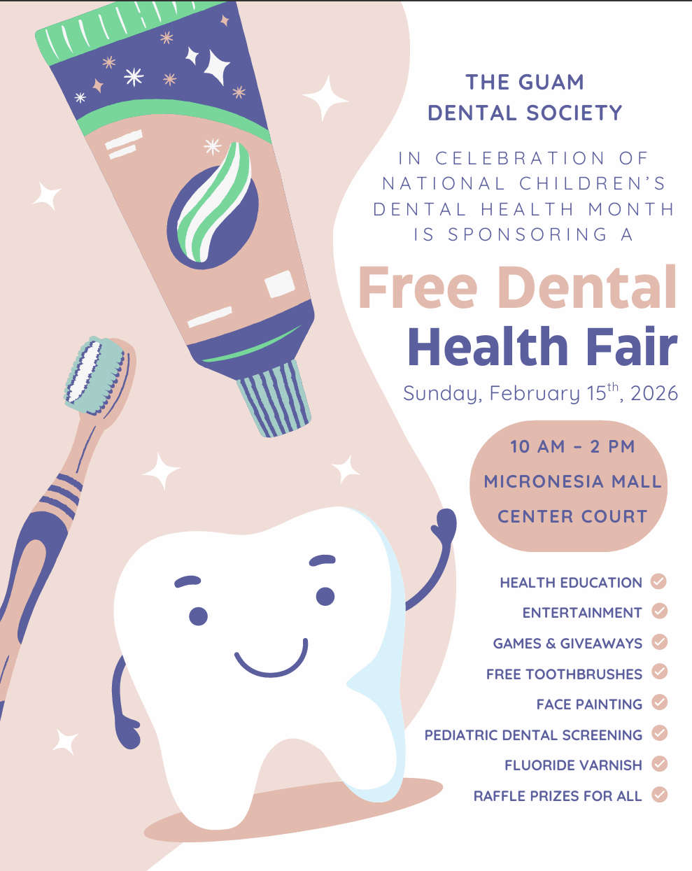 The Guam Dental Society is celebrating National Children’s Dental Health Month with a free Dental Health Fair this Sunday, February 15. The event runs from 10am to 2pm at the Micronesia Mall Center Court and will feature pediatric dental screenings, fluoride varnish treatments, and free toothbrushes for kids.