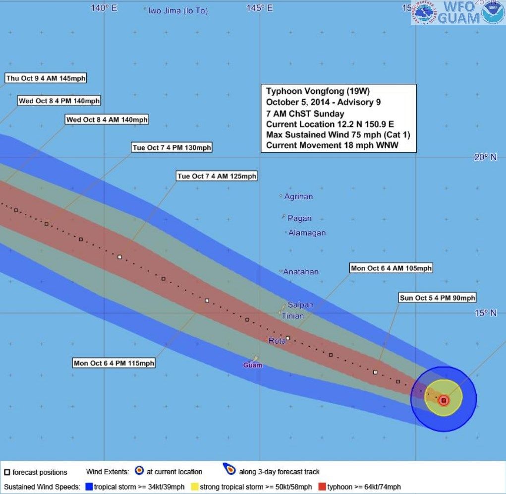 According to the latest information from the National Weather Service, Typhoon Vongfong is located about 350 miles E-SE of Guam and moving northwest at 18 miles per hour. The closest point of approach is expected Monday morning. Maximum sustained winds are 80 miles per hour.