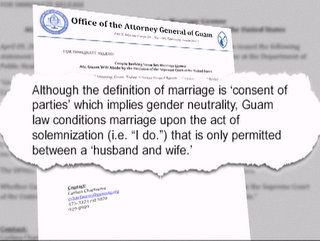 In a statement issued by Guam attorney general Elizabeth Barrett-Anderson, she says Public Health acted in compliance with Guam law, writing, "Although the definition of marriage is 'consent of parties' which implies gender neutrality, Guam law conditions marriage upon the act of solemnization (i.e. 'I do') that is only permitted between a 'husband and wife.' In 1994 the 22nd Guam Legislature further defined marriage in the public health statutes as a relationship between 'persons of opposite sex.'"