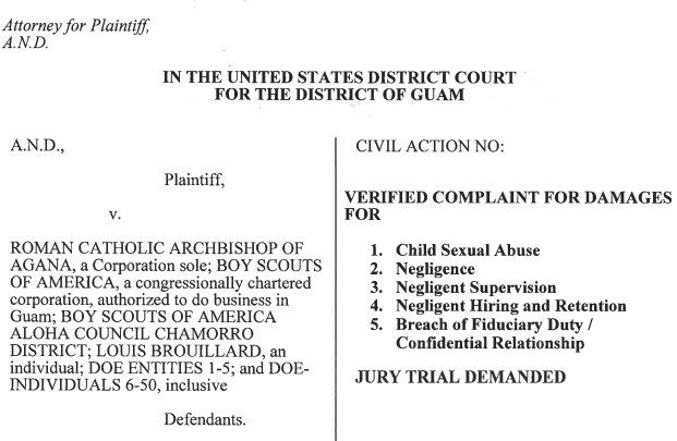 A.N.D. is suing the Archdiocese of Agana, the Boy Scouts of America Aloha Council, and Louis Brouillard for $10 million dollars. He marks the 71st victim to file suit since Guam law was changed to lift the civil statute of limitations on child sex abuse cases.