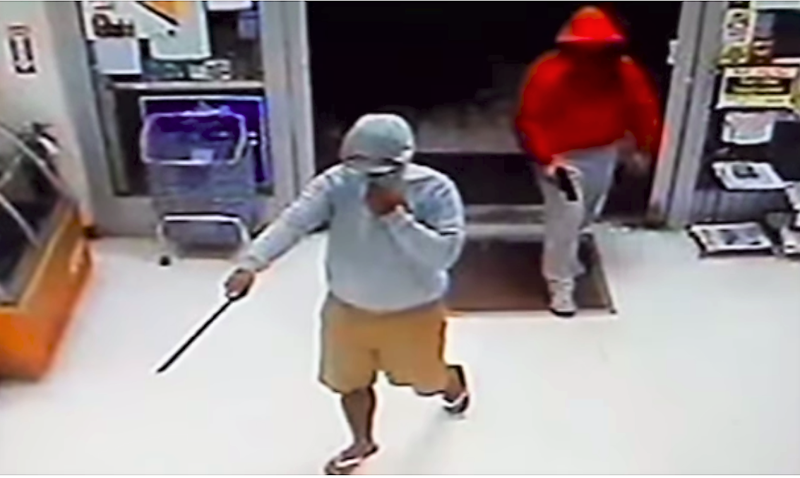 Video surveillance recorded the suspect wielding the machete throw an employee to the ground, forcing them to open the register. The suspects fled with an unknown amount of cash.