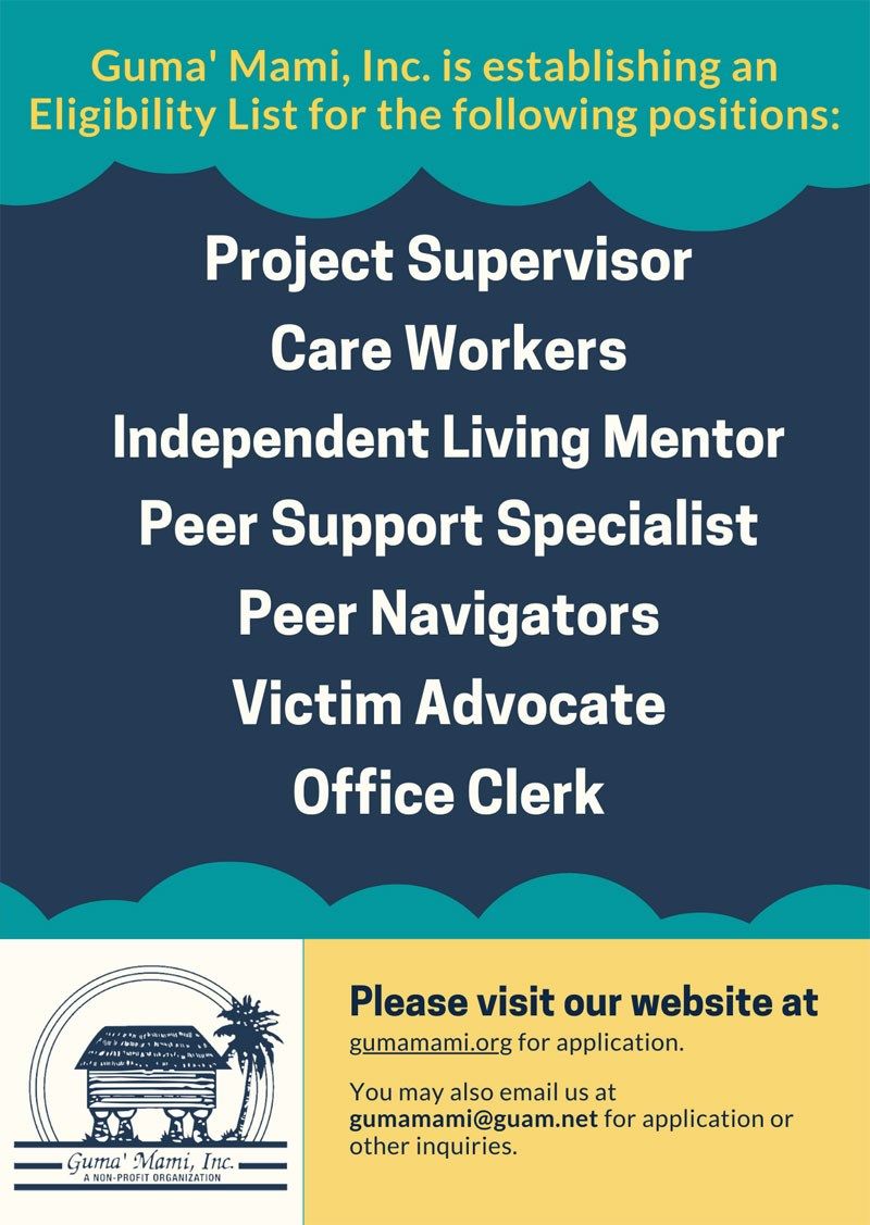 Celebrating its 40th year assisting persons with disabilities, Guma' Mami, Inc. is expanding its services and is looking for help. Several new positions are opening up at the nonprofit as it implements two new projects.