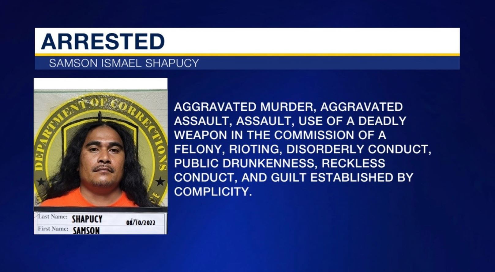 He was rushed to Guam Regional Medical City where he was pronounced dead on arrival. Criminal investigators last night arrested 31-year-old Samson Ismael Shapucy of Yigo for aggravated murder, aggravated assault, use of a deadly weapon in the commission of a felony, rioting, disorderly conduct and public drunkeness. He's currently confined at the Agana Detention Facility.