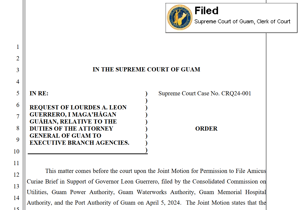 According to the order, the Consolidated Commission on Utilities, Guam Power Authority, Guam Waterworks Authority, Guam Memorial Hospital Authority, and the Port Authority of Guam and any other autonomous agencies that may later join them may file a single amicus brief by May 6.