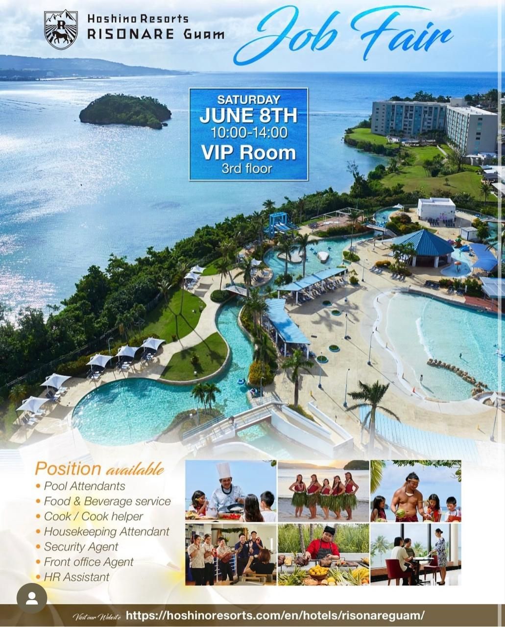 IN NEED OF A JOB? DUST OFF THAT RESUME AND HEAD ON OVER TO HOSHINO RESORTS RISONARE GUAM ON SATURDAY JUNE 8TH FROM 10AM-2PM FOR A JOB FAIR! THE EVENT WILL TAKE PLACE IN THE VIP ROOM ON THE THIRD FLOOR THEY ARE LOOKING TO FILL SUCH POSITIONS LIKE POOL ATTE
