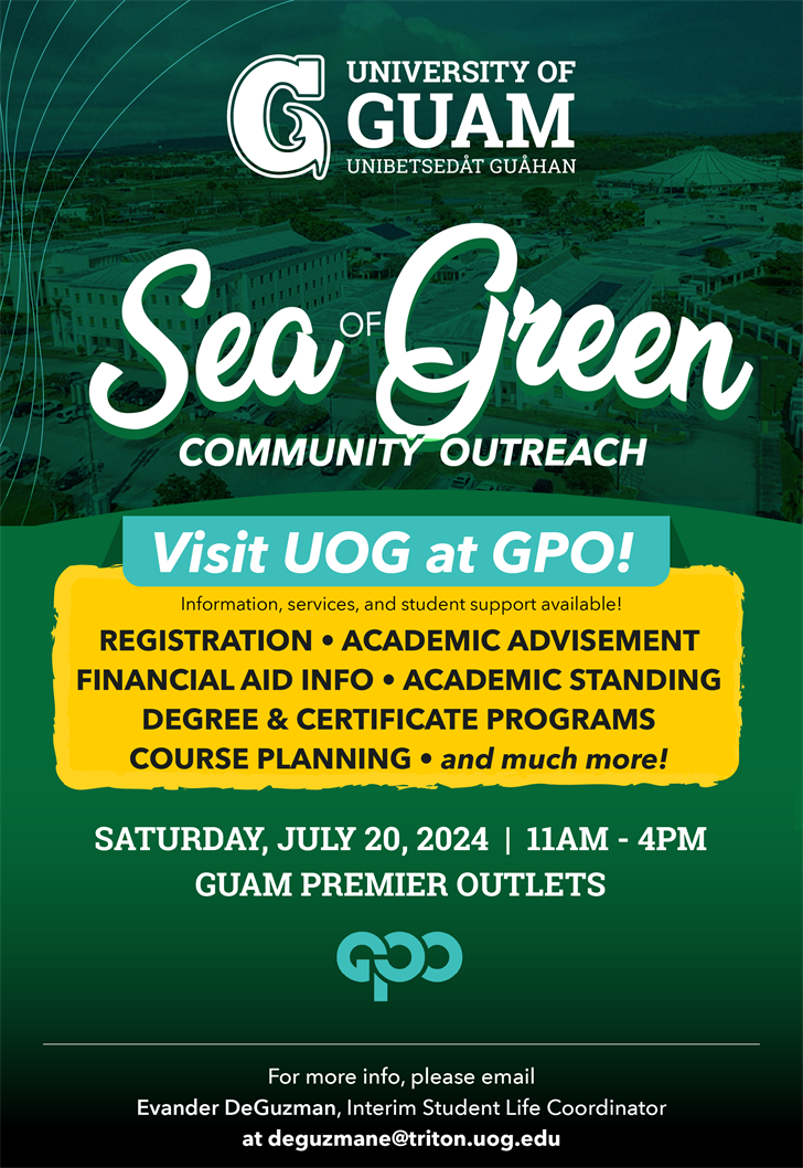 “We’re looking forward to meeting with members of the community — especially our future and current UOG students — at the Sea of Green event at GPO on July 20,” said Dr. Gena Rojas, Interim Dean of Enrollment Management and Student Success.