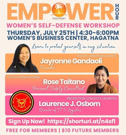 Enhance your situational awareness and personal safety strategies with an upcoming workshop. With the recent cases of theft and burglary the Guam Women's Chamber of Commerce is hosting an 'Empower Hour' featuring key speakers from Pacific Grappling events