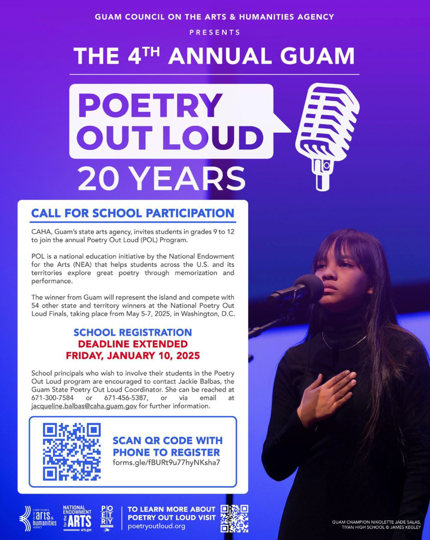 School principals or teachers interested in enrolling their students are encouraged to contact Jackie Balbas, Guam’s Poetry Out Loud Coordinator, at 671-300-7584 or 671-456-5387, or via email at [email protected].