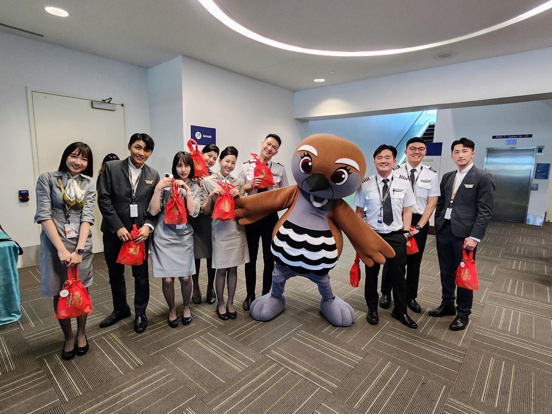 Passengers were delighted to receive the warm Håfa Adai welcome and enjoyed Chamorro music while taking photos with “Kiko” the Ko’ko’ Bird mascot.