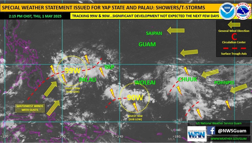 The National Weather Service Guam Office is keeping an eye on two tropical disturbances near Yap and Palau.