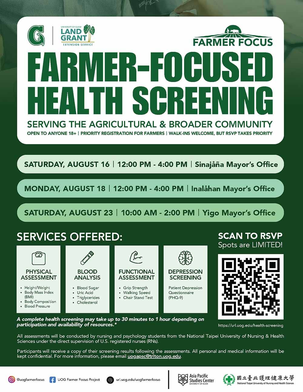 The University of Guam Farmer Focus Project and the UOG Asia Pacific Studies Center will be facilitating three free health screening opportunities this month targeting the agricultural community but open to all residents.