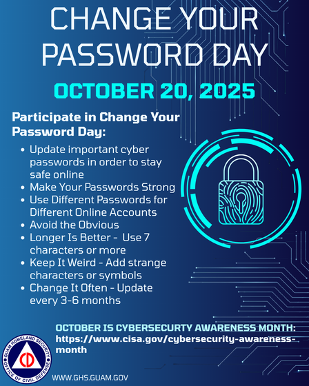 Locally, GHS, OTECH, and the Mariana Regional Fusion Center have launched “Change Your Password Day” on October 20, encouraging the community to update important passwords to stay safe online.